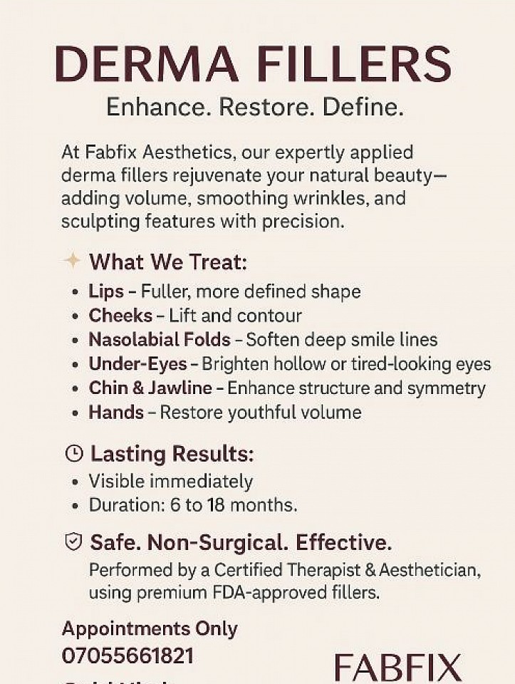 At Fabfix Aesthetics, we are dedicated to helping you look and feel your best. Located in Fidiso Estate, Sangotedo, we offer personalized aesthetic treatments that enhance your natural beauty and boost your confidence with professional, compassionate care. Book an appointment with us today